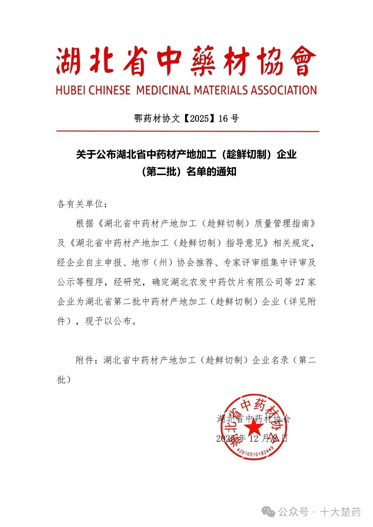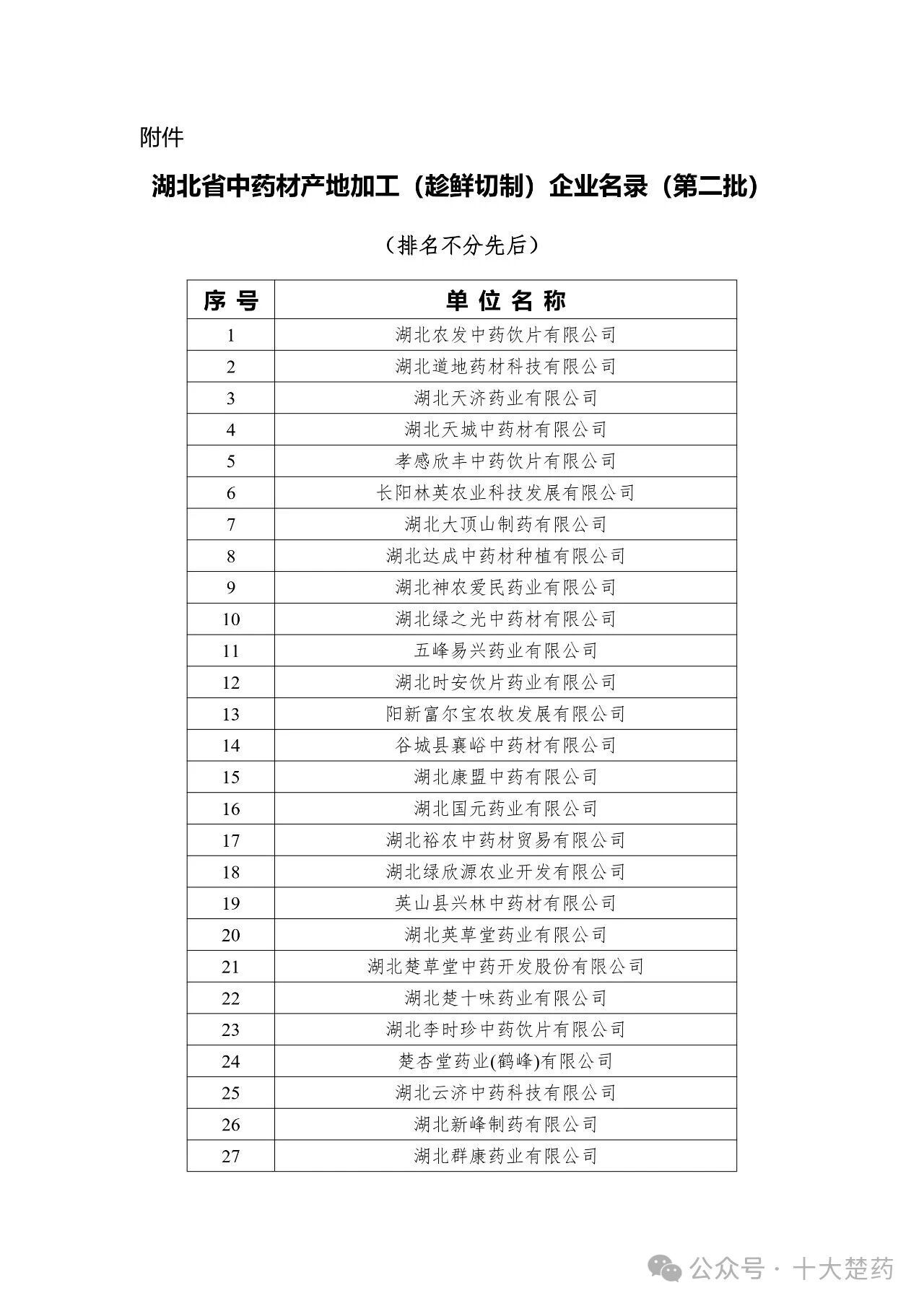 根据《湖北省中药材产地加工(趁鲜切制)质量管理指南》及《湖北省中药材产地加工(趁鲜切制)指导意见》相关规定,经企业自主申报、地市(州)协会推荐、专家评审组集中评审及公示等程序,经研究,确定湖北农发中药饮片有限公司等27家企业为湖北省第二批中药材产地加工(趁鲜切制)企业(详见附件),现予以公布。